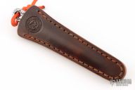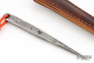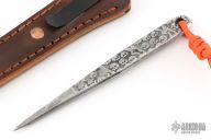 Hand forged by Ryan Johnson at the Gold Point Forge! The Thistle from Ryan is a handy small and discreet EDC companion, that is light enough to carry all day while still being substanial and easy to use. The shaft features a catacombs motif that adds a killer look while also providing a bit of extra traction. The triangular needle like point is perfect for when you need to mark, pry or poke a hole in somthin'! Added cordage on the back to aid in ease of deployment. Comes with a custom leather sheath with IWB clip and finished with Ryan's homemade dye concoction. Note: Each is hand made start to finish. There might be slight differences in dimensions and patterns. Just know yours is unique!