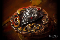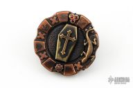 Go all in with this stunning Halloween 2024 Count Chimpula poker chip straight from the main man's bench! Ryk created this stunning piece from individual elements and turned it into one amazing piece. The custom made, hand textured copper poker chip has some solid heft to it, and Ryk gave it a two-tone finish with blackened patina and satin highlights. The front side features a large Count Chimpula with garnet eye and adorned with antique and custom made brass badges! A large brass coffin is on the back side accompanied by a tri-garnet, brass lizard and copper S-Gear. Come's with a stitched Feeleybuilt leather pouch for storage. Never have a dull game of heads or tails again, and always have the coolest coin when the challenge is put out!