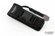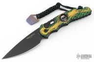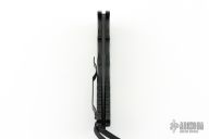This TR-4 has a black finished drop point blade. The handle is P.K. Custom splash anodized aluminum with a sterling silver skull designed by Bruce Shaw inlaid. Black finished stainless steel clip for tip up carry. Steel glass breaker. Secondary safety switch. Includes original box, paperwork and sheath. Excellent Condition. #02/50 for the USN Gathering VI.