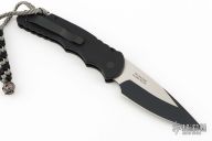 This TR-4 Skull #1 Limited Edition #08 of 200 button lock auto has a two-tone black and satin finished 154-CM stainless steel drop/ spear point blade with swedge. Handle is black anodized aluminum with Bruce Shaw designed sterling silver skull inset, safety button, matte black finished stainless steel tip up clip, and extended stainless steel backspacer with lanyard loop and lanyard with custom two-tone skull lanyard. Comes with PT nylon sheath, original box, and paperwork. Excellent condition.