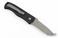 This Emerson/Pro-Tech CQC7 automatic has a chisel ground bead blast finished blade and a black aluminum handle, push button with black G-10 inlay. Bead blasted stainless steel clip, tip up or down reversible. Coil spring. Marked "CQC7 AUTO Prototype #48 of 75" on the back of the blade. Comes with original box. Excellent condition. We believe this knife was offered at the first USN Gathering.