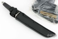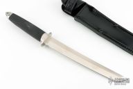 This original magnum tanto by Cold Steel features a satin finished tanto blade. Guard and pommel are stainless. .189" blade stock and 1.096" blade depth. Handle is textured Kraton for a sure non-slip grip. Comes with black leather sheath, original box and papers. Also comes with a Cold Steel display stand. Excellent condition.