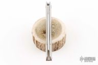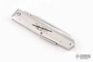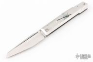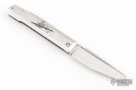 This Model VF by Remy Dupoux features a hand rub satin finished blade with false top edge and fullers. The handle has a hand rub satin finished Z40 stainless steel frame with mother of pearl, black lip pearl and carbon fiber inlays. The handle has hand made titanium screws. Stainless steel backspacer and lock release. Nice lockup and blade seating. Comes with COA and a leather slip sheath. New from maker!