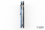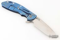 This XM-24 from Hinderer Knives features a stonewashed blade with swedge, dual thumb studs, notched thumb rest and flipper. The handle has a black G-10 scale with a titanium liner on the "A" side and a tumbled and anodized titanium lockside, pocket clip, hardware and lock bar stabilizer, and lanyard hole in pommel. Includes the original box and extra hardware. Comes with a blue G-10 scale as well. Excellent condition.