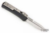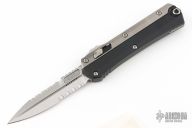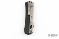 This Glykon by Microtech features a stonewashed double edged fully serrated blade with fullers and notched thumbrest. The handle has a black aluminum chassis with bead blasted titanium overlays and tip down clip. Comes with original box and papers. Dated 06/2023 and #1777.  Excellent condition.