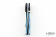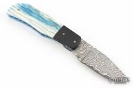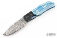 This knife by Jake Elenbaas features a Stainless San Mai Damascus blade with VG-10 core, single thumbstud with a blue stone inlay. The handle has black G-10 bolsters, stabilized giraffe bone scales, anodized titanium liners with jeweled interiors and a black G-10 backspacer. Nice detent, lockup and blade seating. Comes with COA. New from maker.