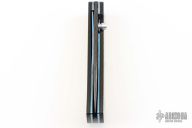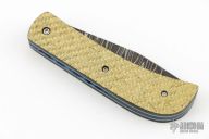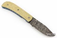 This knife by Jake Elenbaas features an Alabama Damascus blade with single thumbstud with a yellow stone inlay. The handle has corse weave gold carbon fiber scales, anodized titanium liners with jeweled interiors and a black G-10 backspacer. Nice detent, lockup and blade seating. Comes with COA. New from maker.