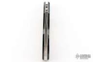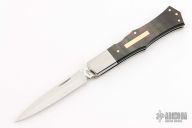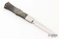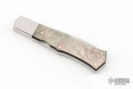 This Midlock Dagger by Ryuichi Kawamura features a hand rubbed satin finished blade with mirror polished ricasso, has a nail nick and false top edge. The handle has integral stainless steel bolsters and liners, gold escutcheon and pins, black lip pearl covers, stainless steel spring. Has some light scratches, otherwise excellent condition.