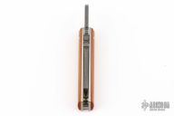 This 86 by Nick Swan features a two-tone blade with notched thumbrest, opens like a friction folder and has a double detent system. The handle has mapple valley richlite scales, blasted titanium liners. Excellent condition.