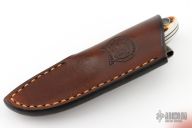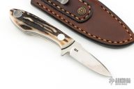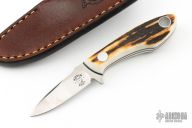 This TK1 by Tom Krein features a satin finished drop point blade with swedge, .100" blade stock and .674" blade depth. The handle has stag scales with an aluminum pin and lanyard tube over black fiber liners and full tang construction. Includes brown leather pocket sheath. Has a small oxidation spot on the blade, otherwise excellent condition. Dated 2021