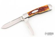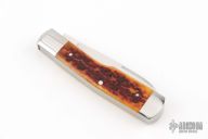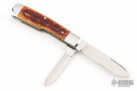 This Gunstock by Richard Rogers features hand rub satin finished blades with nail nicks. The handle has integral stainless bolsters/liners/cap, jigged bone covers with a stainless steel escutcheon, stainless steel springs. Has some light  scratches, otherwise excellent condition.