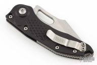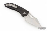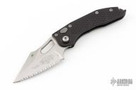 This Stitch Auto by Microtech Knives features a fully serrated stonewashed blade and false top edge, notched thumb and finger rests. The handle has a black milled aluminum handle with a bead blasted titanium backspacer and a bead blasted stainless  steel clip, tip up carry, lanyard hole at the butt. Comes with original box and papers. S/N of 11441 and dated 12/2022. Has a couple light scuffs, otherwise excellent condition.