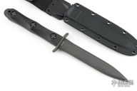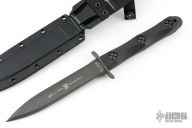 This Model 3 Dagger from Ka-Bar is a John Ek design, it features a black coated spear point blade with false top edge, .155" blade stock and 1.129" blade depth, full tang construction. The handle has a black coated stainless steel guard, plastic scales. Includes molded plastic sheath with belt loop and the original box. Has some light scuffs, otherwise excellent condition.