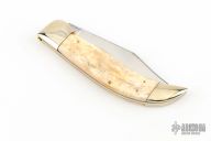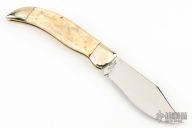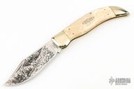 This slipjoint by Star features satin finished blade with nail nick and etched scene. The handle has nickel silver bolsters. bone covers, brass liners and stainless steel springs. Has some light scratches, otherwise excellent condition. Comes with original box.