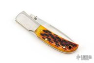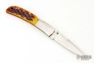 This Falcon by Al Mar features a satin finished blade with false top edge and dual thumbstuds. The handle has stainless steel boslters, jigged bone scales, brass liners, stainless steel backspacer. Comes with original box, papers and brown leather slip sheath. Excelletn condition.