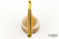 This lock back folder was made for Bianchi by Gerber. It features a satin finished blade with nail nick. The handle has a brass frame with yellow paper micarta scales, stainless steel backspacer. Comes with original box and papers. Has a few light scratches, otherwise excellent condition.
