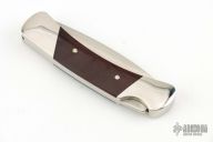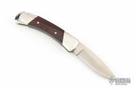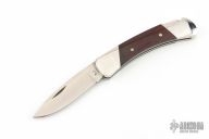 This Model 500 Duke by Buck has a satin finished drop point blade with nail nick. The handle has a stainless steel frame, maroon linen micarta scales and a stainless steel backspacer. Comes with original box, papers and leather sheath. Excellent condition.