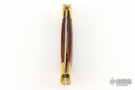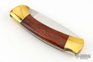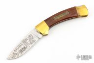 This knife by Boker features a mirror finished blade with etched scene. The handle has a brass bolsters, liners, stainless rocker bar, with rosewood inlays. Comes with original box. Has some light scratches, otherwise excellent condition.