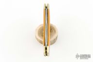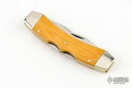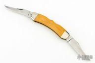 This Texas Lock Horn by Case Knives features two satin finished blades with nail nicks. The handle has nickel silver bolsters, yellow paper micarta scales, brass liners and stainless steel backspacers. Comes with a original box, sheath and papers. Has a few light scratches, otherwise excellent condition. Has "Cabela's" on the blade