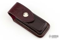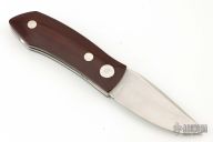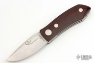 This Barry Wood design swing lock folder features a satin finish blade and satin finish stainless steel frame with maroon linen micarta scales. This is a very unique scissor opening folder, which when the blade is fully open and locked in place is almost a fixed blade knife. The handle is nicely contoured for a comfortable grip. Opening is accomplished by lighting pressing down and outward at the rear indentation on the spine, which releases the locking pin and allows one side of the handle and the blade to rotate down then forward until the blade locks in the forward position. The one side of the handle continues to rotate back until it locks in place. Closing requires the same slight thumb pressure at the indentation to release the locking pin, then the one side of the handle is rotated back and around, catching the blade and aligning both with the other side of the handle in a locked closed position.  Comes with a leather Colt belt sheath and original box.. Has some scuffs and scratches, otherwise good condition.