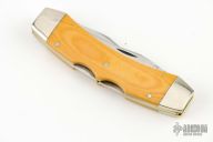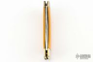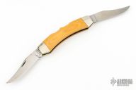 This Texas Lock Horn by Case Knives features two satin finished blades with nail nicks. The handle has nickel silver bolsters, yellow paper micarta scales, brass liners and stainless steel backspacers. Comes with a original box, sheath and papers. Has a few light scratches, otherwise excellent condition.