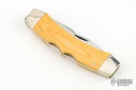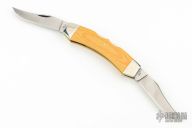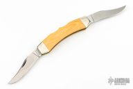 This Texas Lock Horn by Case Knives features two satin finished blades with nail nicks. The handle has nickel silver bolsters, yellow paper micarta scales, brass liners and stainless steel backspacers. Comes with a original box and sheath. Has a few light scratches, otherwise excellent condition.