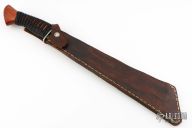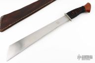 This Custom Machete by Shiva Ki features a hand rub satin finished blade with visible hamon, .176" blade stock and 2.465" blade depth, hidden tang construction. The handle has a nickel silver guard and cord wrap over cocobolo grip. Includes leather sheath with belt loop and a zippered case. Has some very light scratches and a couple of marks on the butt of the handle, otherwise excellent condition.