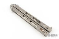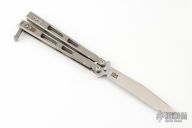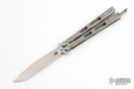 This Nieves Balisong by Hinderer features a stonewashed blade. The handle has stonewashed titanium handles with titanium filler tabs and T-latch. Comes with original box and card. Has been resharpened, otherwise excellent condition.