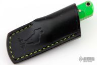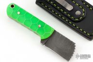 This knife by Joey Roman features a black blade with fileworked spine, .122" blade stock and 1.071" blade depth, full tang construction. The handle has green C-Tek scales with green G-10 liners. Comes with a black leather sheath with pocket clip. Has some scrathces, otherwise good condition.