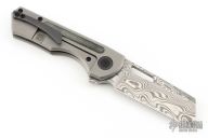 This EDC Foundry Yeager-M v2 by Brian Brown features a wharncliffe Damasteel blade with thumbhole and flipper. The handle has a tumbled titanium frame with black canvas micarta inlays, black titanium pivot collars, tip up clip and backspacer. Has a couple light scuffs, otherwise excellent condition.