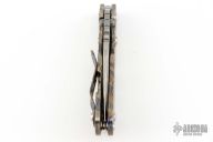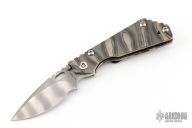 This PT by Mick Strider features a two-tone striped blade with notched thumbrest and thumbhole. The handle has a flame finished titanium frame with matching tip up clip. Has a couple light scuffs, otherwise excellent condition.