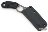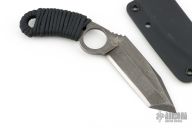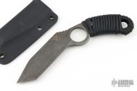 This pistol grip tanto by RVF Designs features a chisel ground tanto blade with notched thumbrest, .212" blade stock and 1.218" blade depth, full tang construction with black cord wrap. Comes with a kydex sheath. Has some scuffs, otherwise excellent condition.