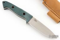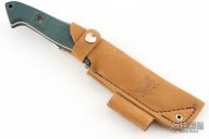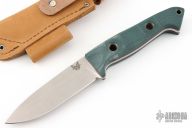 This Bushcrafter from Benchmade features a drop point tumble finished blade with .165" blade stock and 1.156" blade depth, full tang construction. The handle has a green G10 scales over red liners and full tang construction with hollow pins and a lanyard tube with lanyard. Includes original box, papers and leather sheath with a belt loop.  Excellent Condition.