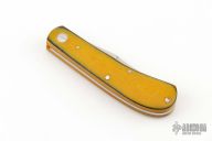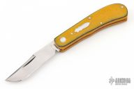 This Trapper by Luke Swenson features a hand rub satin blade with swedge and nail nick. The handle has vintage linen micarta covers, stainless steel escutcheon, stainless steel spring. Has half-stop. Comes with zippered case. Excellent condition.
