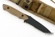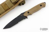 This Nimravus by Benchmade has a black tanto blade with partially serrated edge, 1/8" blade stock and 1 1/8" blade depth, full tang construction with tan aluminum scales and lanyard hole. Nylon tactical belt sheath. Allen Elishewitz design. Comes with original box and papers. Excellent condition.