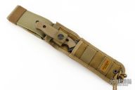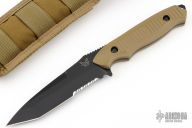 This Nimravus by Benchmade has a black tanto blade with partially serrated edge, 1/8" blade stock and 1 1/8" blade depth, full tang construction with tan aluminum scales and lanyard hole. Nylon tactical belt sheath. Allen Elishewitz design. Comes with original box and papers. Excellent condition.