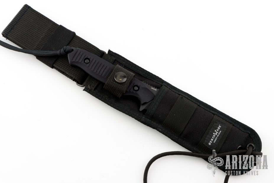 This Nimravus by Benchmade has a black tanto blade with partially serrated edge, 1/8" blade stock and 1 1/8" blade depth, full tang construction with black aluminum scales and lanyard hole. Nylon tactical belt sheath. Allen Elishewitz design. Excellent condition. Comes with original box and papers.