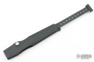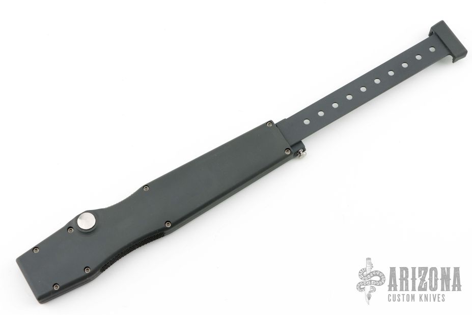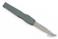 This Combat/Front Opener by Microtech Knives features a bead blasted clip point blade with sharpened top edge. Single action, side positioned button for firing. Closure via a reverse charging handle in the rear of the frame. The handle has a contoured aluminum frame with rubber grips on the top and bottom of the frame. Dated 04/95 and S/N 286.  Includes original box, papers and nylon sheath. Excellent condition.