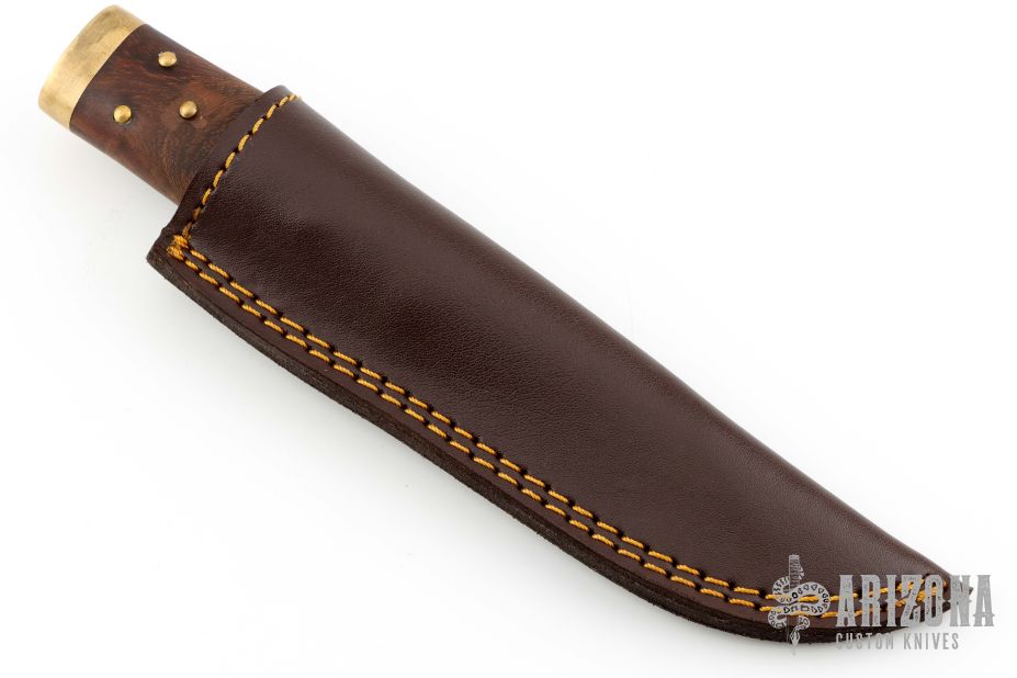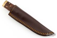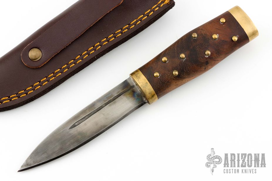This Sgian Dubh features a dark satin finished blade with fullers, .157" blade stock and .855" blade depth, hidden tang construction. The handle has a brass guard and butt with a wood grip that has brass studs. Comes with a brown leather sheath. Has some patina, otherwise excellent condition.