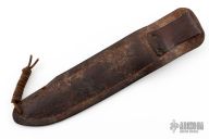 This Fighter by FJ Richtig features a satin finished clip point blade with a nearly sharpened top edge, .215" blade stock and 1.235" blade depth, hidden tang construction. The handle has a brass guard and butt with stacked leather grip, has black/red spacers. Comes with a brown leather sheath. Has some scratches, oxidation and patina, otherwise good condition for its age!