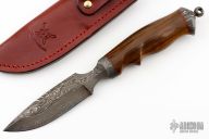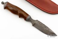 This knife by Alexey Fedotov features a 2-Bar Damascus drop point blade with integral guard, .143" blade stock and 1.169" blade depth, hidden tang construction. The handle has a Damascus butt and lanyard bail, bocote wood grip. Comes with a brown leather sheath. Excellent condition.