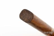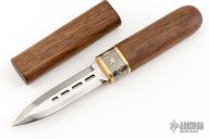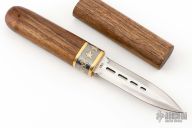 This knife by A&R features a stainless Damascus double edge blade with .151" blade stock and .788" blade depth, hidden tang construction. The handle has a carved walnut grip with a guard that has gold and rhodium plating. Comes with a matching walnut scabbard. When the knife is in the scabbard, it looks like a cigar. Excellent condition.