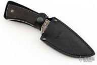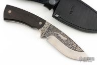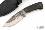This Hunter by Basko knives features a hand rub satin finished blade with engraved flats, .168" blade stock and 1.494" blade depth, full tang construction. The handle has engraved titanium bolsters, ebony wood scales. Comes with a black leather sheath. Excellent condition.