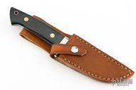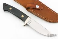 This Drop Point Hunter by Steve Voorhis has a mirror polished drop point blade with full tapered tang. Blade stock is .198", depth 1.117". Handle has a nickel silver single guard, black canvas micarta scales, lanyard hole at the butt. Comes with a brown leather sheath. Excellent condition.