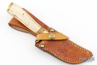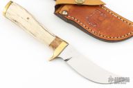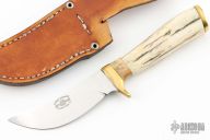 This hunter by Larry Durand features a mirror polished blade, .130" blade stock and 1.029" blade depth, hidden tang construction. The handle has a brass guard and butt, ground stag grip with maple wood spacer and a brass pin. Comes with a hand tooled brown leather sheath. Has a few light scratches, otherwise excellent condition. #9536 on the blade.