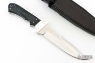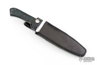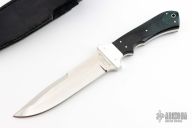 This Fighter from P. Sheehan features a satin finish drop point blade with false top edge, .252" blade stock and 1.254" blade depth, full tang construction. The handle has aluminum bolsters with dymondwood scales and nickel silver pins. Comes with a black leather sheath. Excellent condition.