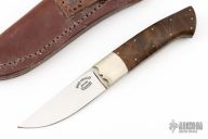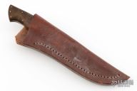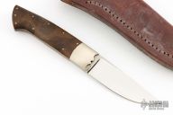 This hunter by Bud Nealy has a mirror polished blade with satin flats, .154" blade stock and .998" blade depth, full tapered tang construction. The handle has dovetailed nickel silver bolsters with walnut scales and nickel silver pins. Comes with a brown leather sheath. Dated 1988 and #312. Has a couple extremely light scratches, otherwise excellent condition.