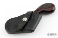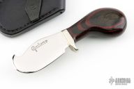 This knife by Linden Daudette features a mirror polished blade with notched thumbrest and guthook, .139" blade stock and 1.381" blade depth, hidden tang construction. The handle has a nickel silver guard, dymondwood grip with a black spacer. Comes with a black leather sheath. Excellent condition.