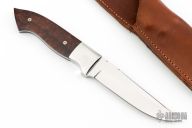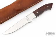 This fixed blade from Jerry Corbit features a mirror polished blade with false top edge and fileworked thumbrest, full tapered tang construction. The handle has dovetailed stainless steel bolsters and ironwood burl scales with mosaic pins. Has some very light scratches, otherwise excellent condition. Comes with a brown leather sheath.