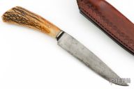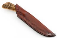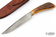 This hunter by Landers Frary & Clark features a drop point blade with false top edge and integral bolster, .080" blade stock and 1.100" blade depth, hidden tang construction. The handle has a stag grip with metal inlay in the butt. Comes with a hand tooled brown leather sheath. Has some light pitting and patina, otherwise good condition for its age.